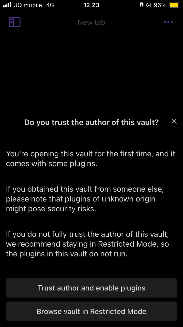 Obsidianを起動し、移動させたvaultを開こうとすると、信頼するとどうか聞かれますがとりあえず信頼しておきます