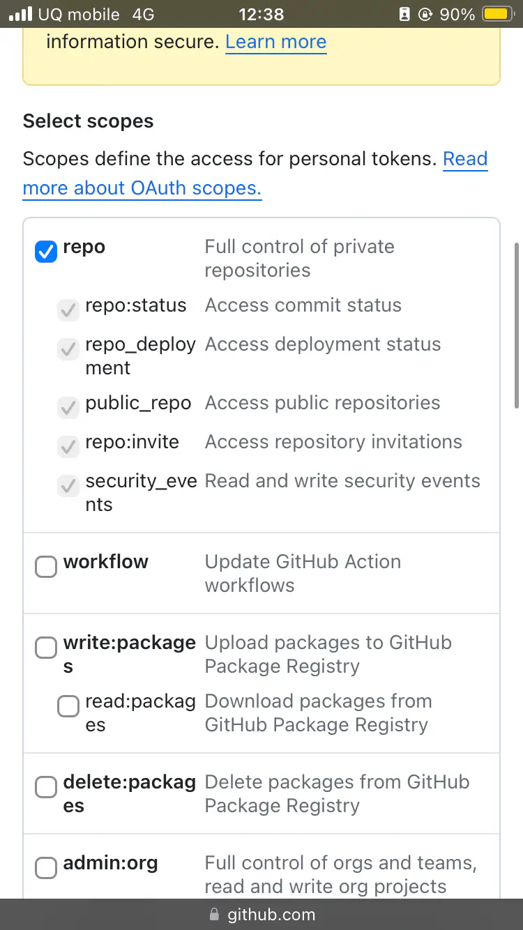 Personal access tokensというものを使用するようです! (最初はfine-grained tokensを取得しようとしたのですがなぜかうまくいかなかったので、classicと書かれている方を取得しました……モバイルのブラウザだとうまくいかないとかあるのかなぁ…