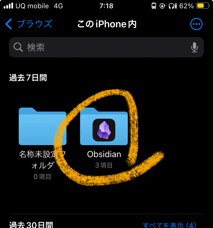(お前の環境だけ…ってやつかもしれないですが、自分の場合、vaultを作成してもこのObsidianディレクトリが見つからず、途方に暮れていた時にiPhoneを再起動ところ、Obsidianディレクトリが表示されるようになったので太字にしました……だいぶこれに時間を取られてしまったので……)