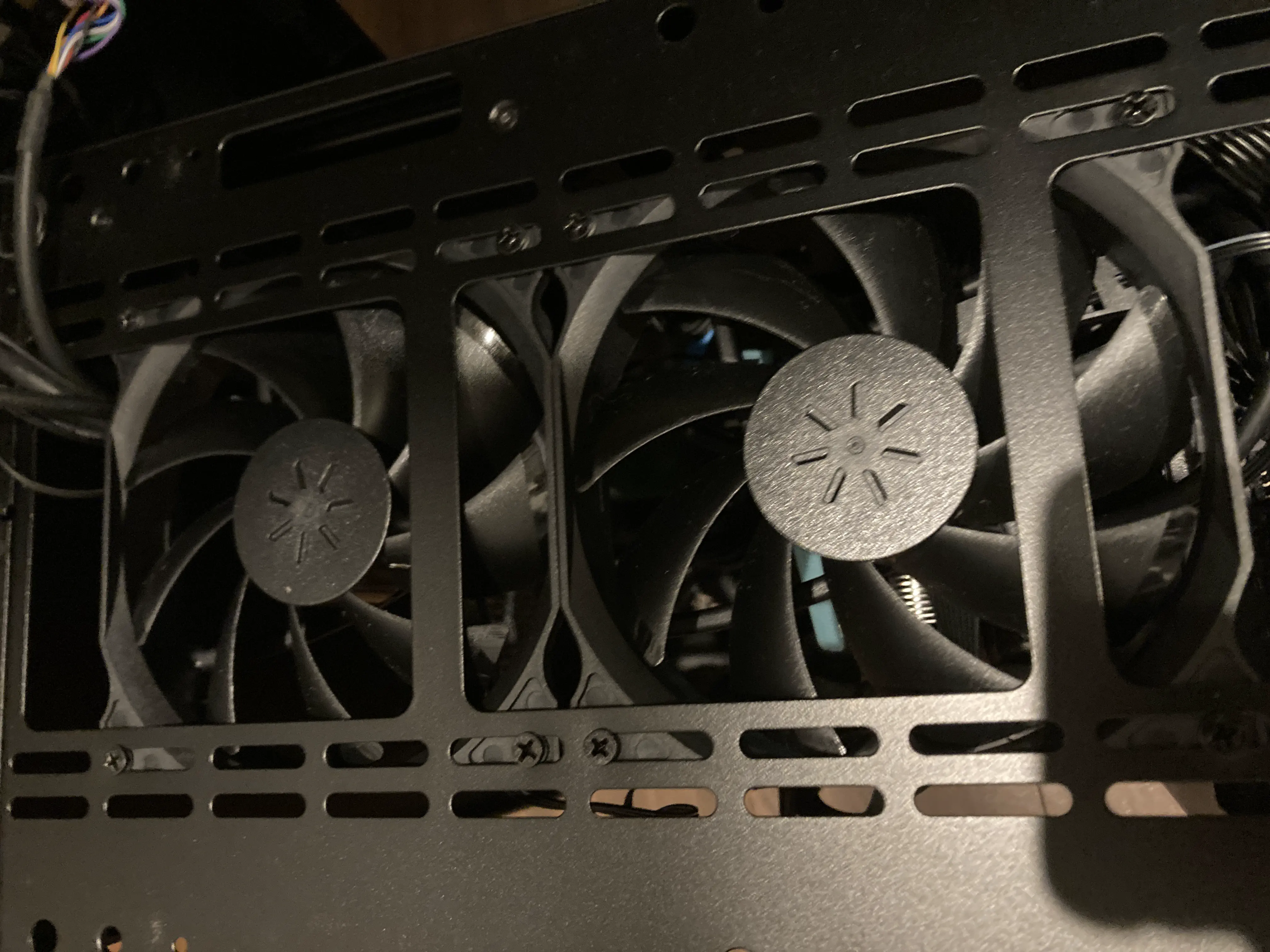 前面に二つ取り付けました。ケース内に風を送る様に設置したつもり。なんかこれ以上下につけてもマザーボードに風が当たりそうになかったので二つだけつけた!