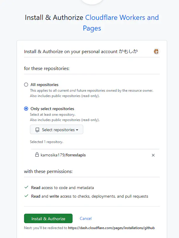 ブログを管理しているリポジトリを選択してinstall & Authorizeをクリックする