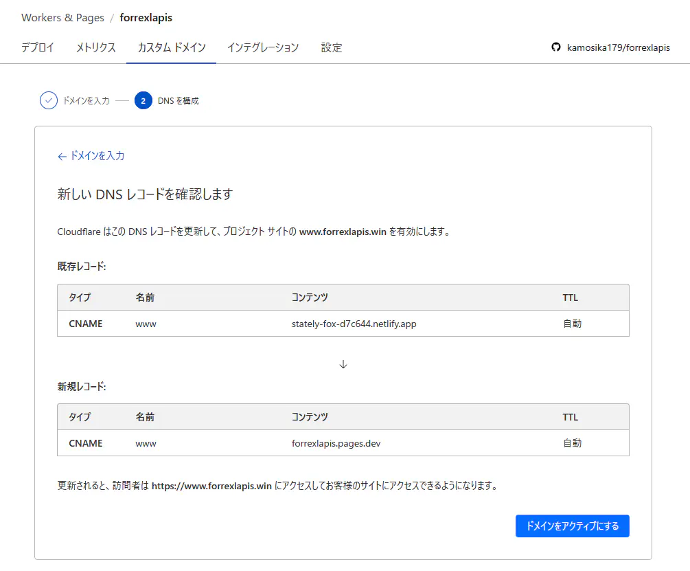 多分すでに登録されていたNetlifyのものを上書きしてくれるらしい。やったね。