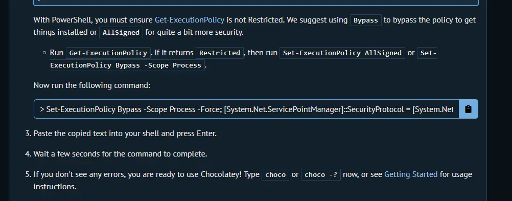 Go言語は普通のアプリみたくダウンロードしたファイルをクリックしていくだけで導入できたっぽいけど、Dart Sassの方は、導入するためにChocolateyというものを使うらしく先にそれを導入した