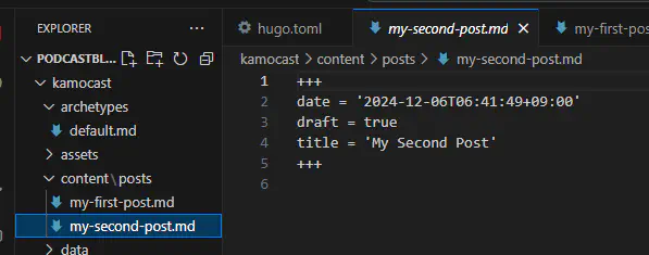 などとすると、contentの下にpostsというディレクトリを作ってその中に記事のひな型が適用されたマークダウンファイルを作ってくれる