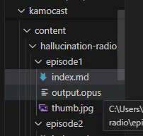 で、セクション名/episode1/内に音声ファイルとかサムネイル用にファイルとかを置いていて、そのファイル名をここで指定している。